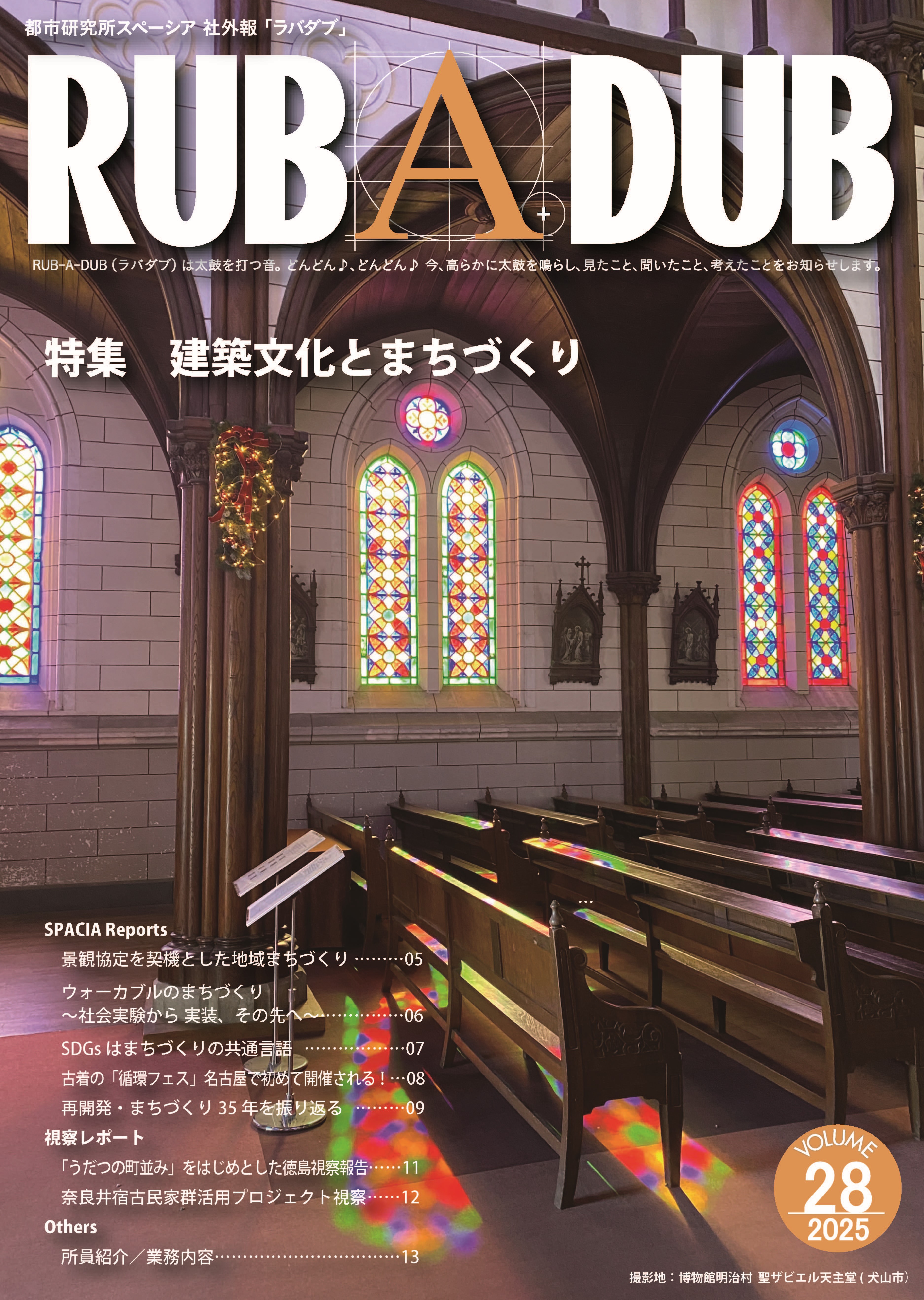 RUBADUB社外報 RUBADUB HOME RUBADUB社外報 RUBADUB2025(第28号) 特集 建築文化とまちづくり 特集 建築文化とまちづくり(PDF) SPACIA Reports 景観協定を契機とした地域まちづくり(PDF) ウォーカブルのまちづくり~社会実験から実装、その先へ~(PDF) SDGsはまちづくりの共通言語(PDF) 古着の「循環フェス」名古屋で初めて開催される!(PDF) 再開発・まちづくり35年を振り返る(PDF) 視察レポート 「うだつの町並み」をはじめとした徳島視察報告(PDF) 奈良井宿古民家群活用プロジェクト視察(PDF) 最終更新日:2025.9.22 アーカイブ一覧 RUBADUB2025(第28号) RUBADUB2024(第27号) RUBADUB2023(第26号) RUBADUB2022(第25号) RUBADUB2021(第24号) RUBADUB2020(第23号) RUBADUB2019(第22号) RUBADUB2018(第21号) RUBADUB2017(第20号) RUBADUB2016(第19号) 「ラバダブ」の旧ホームページの一覧はこちら 名古屋まちづくり情報 Information 視察レポート Report 住まいまちづくりコラム Columun 図書紹介 Books