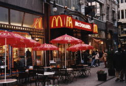 | 仕事柄、海外調査に出かける機会が多い。その際の都市共通観察対象として、第1にオープンカフェ、第2に百貨店、第3にマクドナルドの三つがある。 第1のオープンカフェは、豊かな屋外空間の活用の仕方、にぎわい景観の創出方法を学ぶためであり、名古屋への導入の参考にしようというもの。第2の百貨店は、その国、その都市の物的豊かさ、物価水準、流行を見る上でコンパクトにまとまった場所であるから。 さて、第3のマクドナルド(以下、マック)は、世界のあらゆる都市に進出しているので、諸都市の景観行政(言い換えれば景観に対する市民の価値観)の水準を見る絶好のバロメーターとなるからである。また、マック側も非常に柔軟に対応していることも見て取れる。 マックの一般的なデザインは目立つ赤帯の上に黄色い「M」と白い「McDonald's」のロゴである。ヨーロッパの諸都市は歴史的な景観を有しており、マック側がまちなみ景観に違和感なく立地しようとしているのか、行政的な景観規制を受け止めるのかして(おそらく後者であろう)、標準的なマックの店舗デザインを見ることは難しい。 |