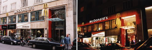 | パリ・シャンゼリゼ通、コペンハーゲンのストロイエ通、ベルリンのダウンタウンのマックは赤帯でなく黒帯の上にロゴが書かれている。ミラノのガレリアにあるマックは赤色を一切使わず、銀色の「M」も使用しながら、周辺から浮き立つことなくシックな感じでまとめている。ツェレのような町全体が歴史的建造物で成り立っている街では、白の「McDonald's」の文字があるのみであった。 目立つ赤色の取り扱いに工夫している例もある。ストックホルムやウィーンで見たマックは、昼間はネオンサインを消しており、店舗も落ち着いた雰囲気を醸し出しているが、夜間になると赤が際だち、昼と夜のこの変化が違和感なく受け入れられる。 |