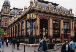 | 昨年(1999年)にブダペストへ行く機会があった。たまたまガイドブックを見ていると、西駅に「世界一美しいマクドナルドがあることで有名」という文字が目に飛び込んできた。駅舎と一体となったデザインで(因みにこの駅舎はエッフェル塔を設計した会社が3年かけて建設したそうな)、レンガ化粧が施され、おそらく以前は駅関連のオフィスなどに利用されていたのであろう。内部は天井が高く、そのため天井から吊す照明はシャンデリア風となり、床からの照明燈もあって、明るく落ち着いた雰囲気がある。中地下にカウンターがあり、中2階と1階が飲食空間になっている。通常のマック仕様では空間に負けてしまうので、そのような質にせざるを得なかったのであろう。 | ![]() |